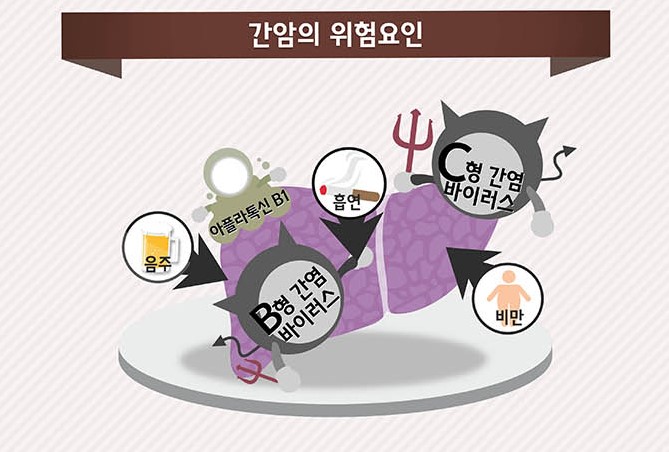 우리나라의 경우 전체 간암 환자의 75% 가량이 B형 간염바이러스(HBV, hepatitis B virus) 보유자입니다. 이들 중 연령이 높거나 간경변증이 있는 사람에게 간암이 더 잘 생기며, C형 간염바이러스(HCV) 중복 감염과 과도한 음주도 간암의 위험을 높입니다. 성별로는 남자가 더 위험합니다.