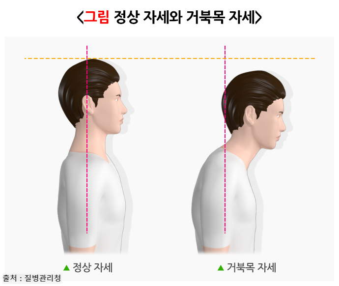 거북목은 머리가 앞으로 튀어나와 목이 굽어진 상태를 말합니다. 마치 거북이 머리를 앞으로 내민 모습과 비슷하다고 하여 '거북목'이라는 이름이 붙었습니다. 이 상태는 목의 자연스러운 C자 커브가 사라지고, 머리가 목 앞쪽으로 돌출된 형태로 변형됩니다.