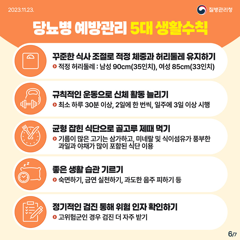 - 규칙적인 운동: 매일 30분 이상의 중등도 운동을 권장합니다.