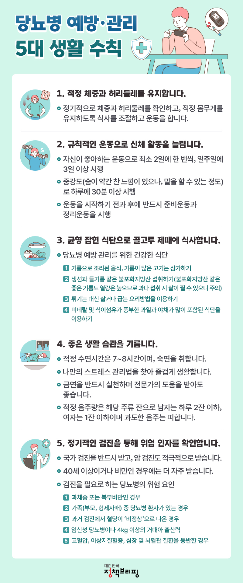 정기적인 건강검진을 통해 혈당 수치를 체크하고, 이상이 있을 경우 조기에 발견하여 관리하는 것이 중요합니다. 특히 가족력이 있는 경우 정기적인 검진이 필수적입니다.