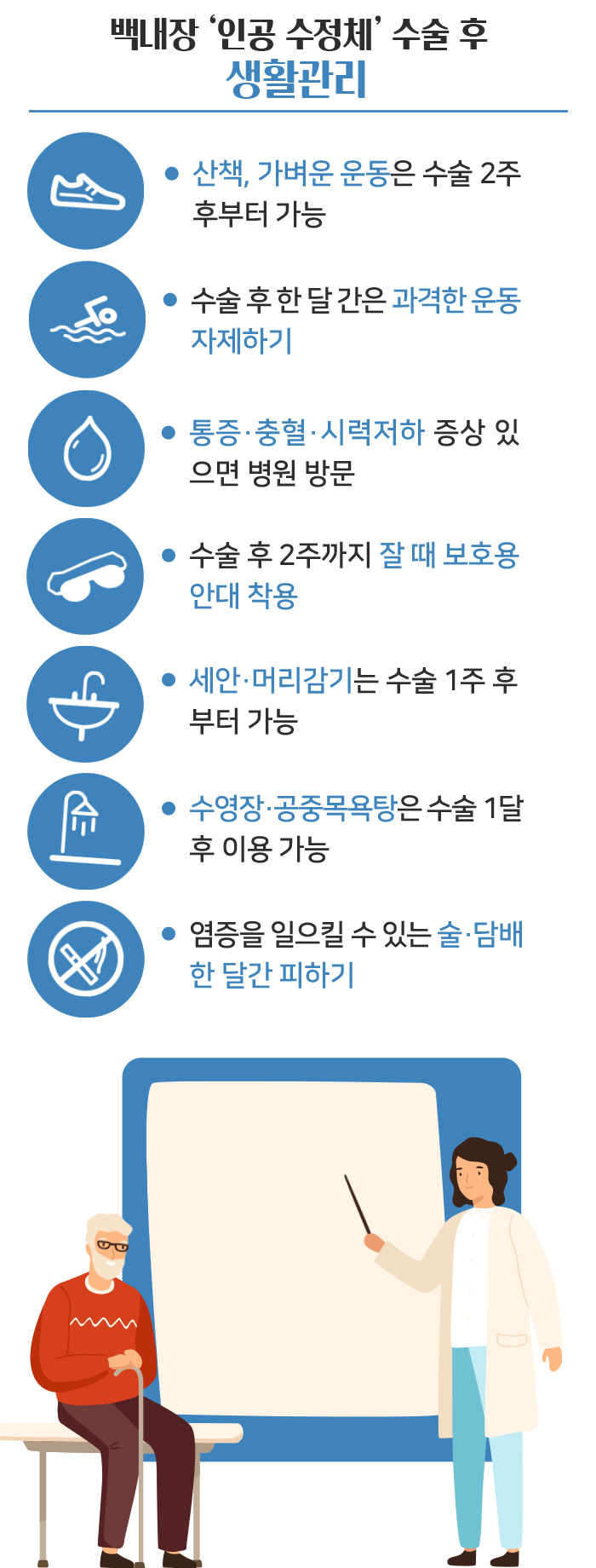 백내장 수술 후 회복 기간 동안 다음과 같은 사항을 주의해야 합니다.