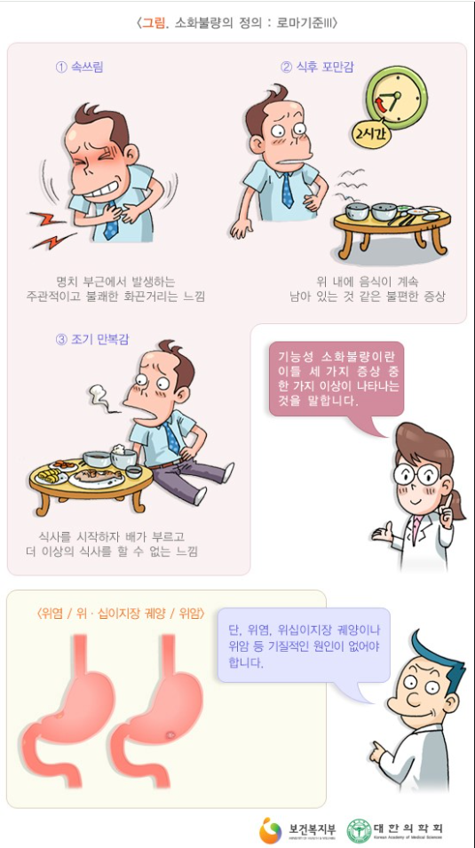 로마기준Ⅲ에서 소화불량을 “위 십이지장 영역에서 발생되는 증상인 식후 포만감, 조기 만복감, 속쓰림(epigastric burning) 중 한 가지 이상 호소할 때”라고 정의하고 있습니다.