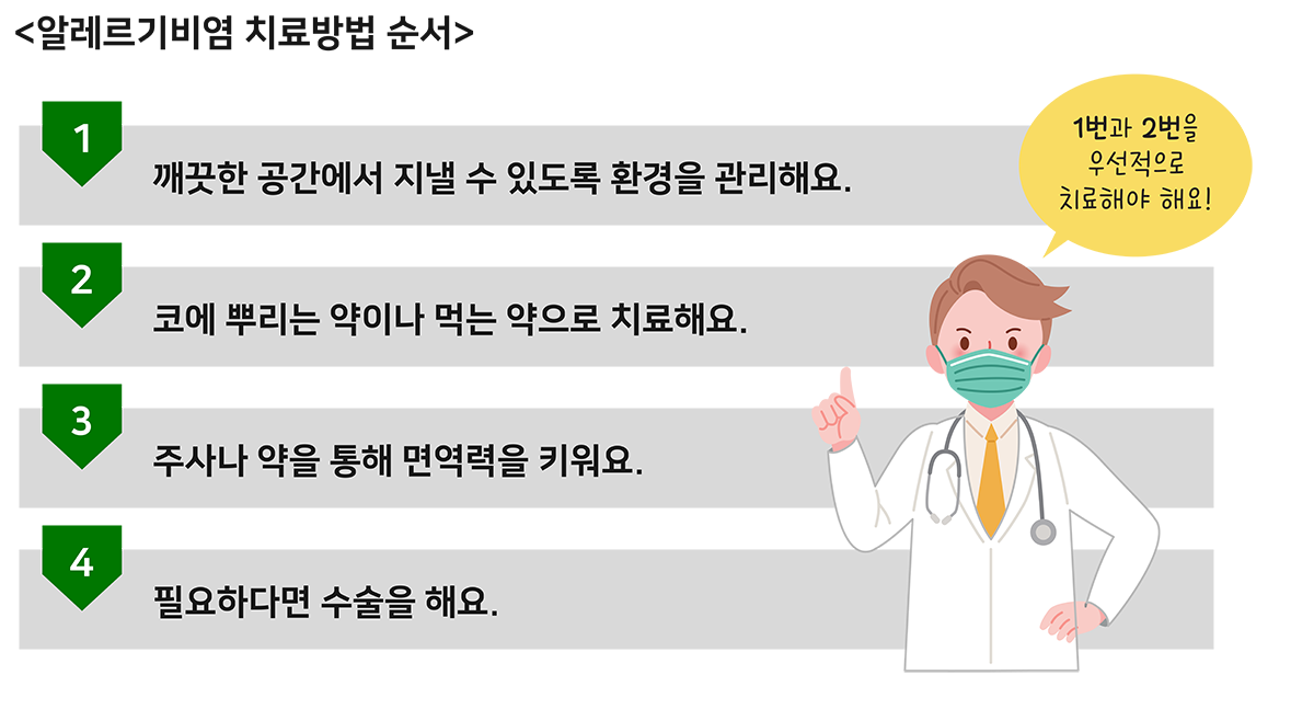 알레르기 비염의 치료 방법은 원인 물질을 피하는 것 외에도 다양한 약물 요법과 면역 요법이 있습니다: