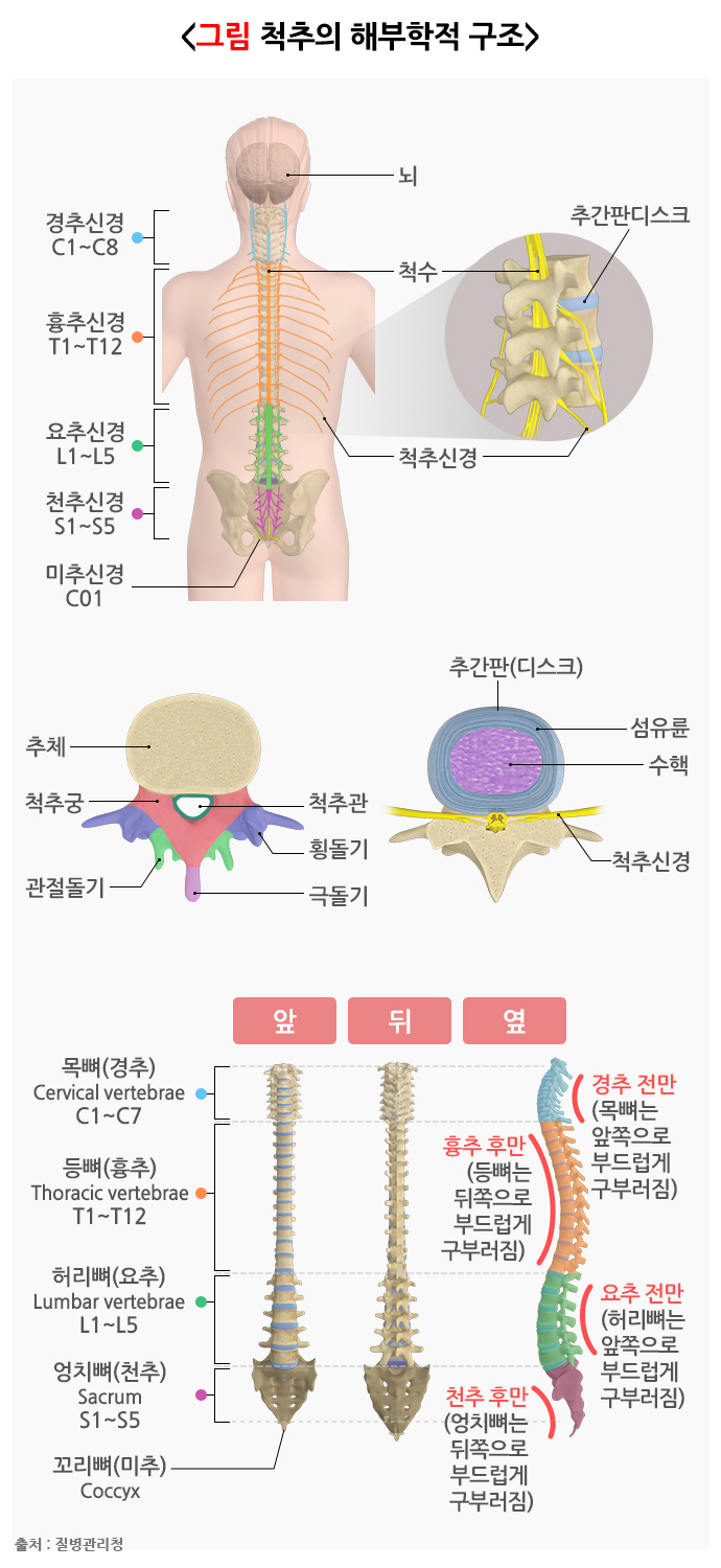 사람의 척추는 경추, 흉추, 요추, 천추 등 4가지로 구성되어 있습니다. 흉추는 갈비뼈가 둘러싸고 있어 움직임이 적고, 천추는 추간판이 없이 하나로 붙어 있어서, 추간판탈출증은 비교적 움직임이 많은 경추와 요추에서 주로 발생합니다.