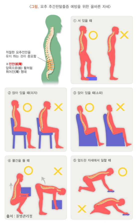 앉거나 설 때 올바른 자세를 유지하고, 무거운 물건을 들 때는 허리를 굽히지 말고 무릎을 굽혀서 들어야 합니다.